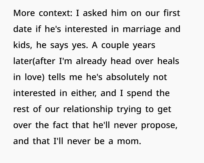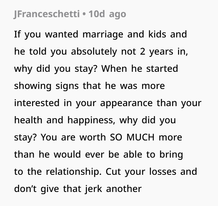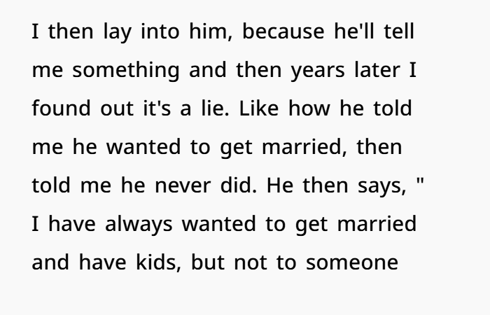 He said he didn’t want marriage or kids… then years later says, “I always wanted those things — just not with someone I’m not attracted to.” That’s manipulative. That’s moving the goalposts so he can keep you around while keeping you at a distance emotionally.