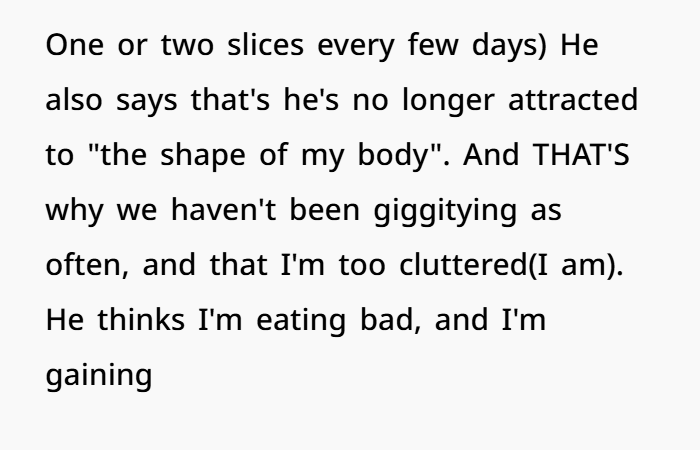You said you’re happy with your body. That’s amazing. And rare. So many people are googling “how to love my body after weight gain,” or “my partner doesn’t find me attractive anymore — what do I do?”