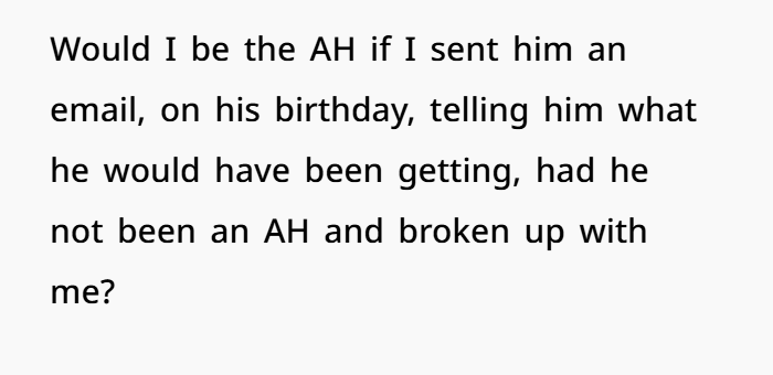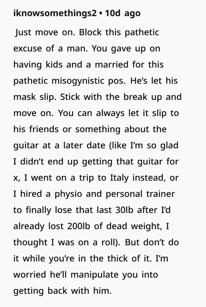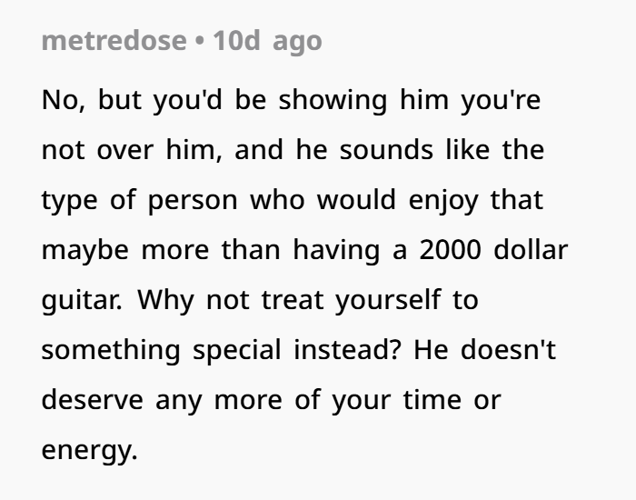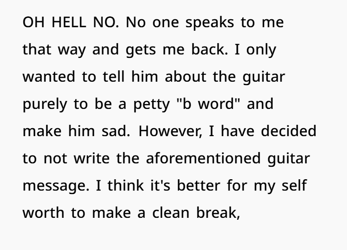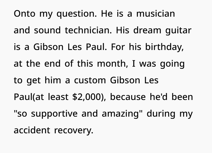 Now here’s the twist: I was planning to buy him a custom Gibson Les Paul for his birthday — the dream guitar he’s wanted forever. It cost over $2,000. A huge, loving surprise to thank him for being “so amazing” during my recovery. But now? I’m wondering if I’d be the asshole for telling him what he would have gotten if he hadn’t dumped me like trash over the shape of my stomach.