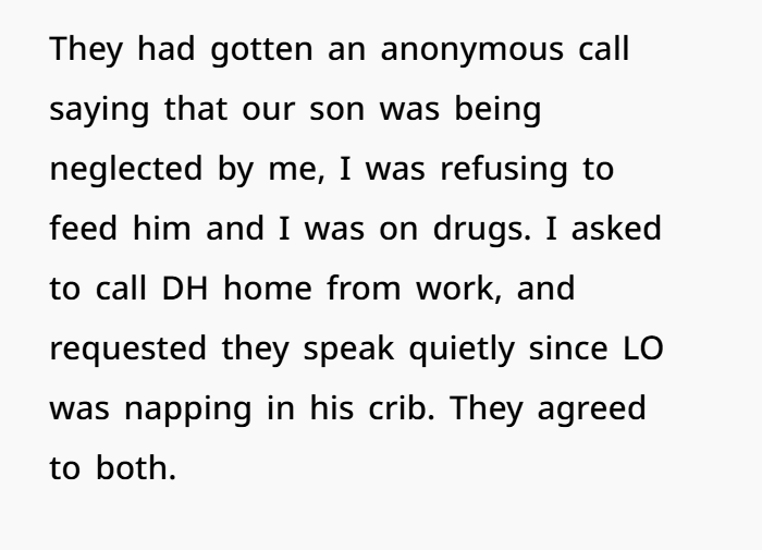 When CPS gets a call claiming neglect, especially involving a newborn or infant, they are legally required to investigate. That means: