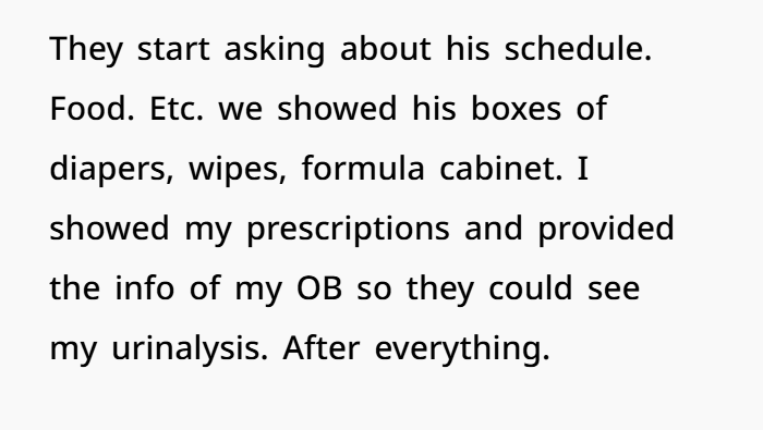 It feels invasive. It feels violating. But they have protocols. In my case, they documented everything. Nursery conditions. Formula supply. Diapers. Prescriptions. Even the pediatrician visit earlier that day.