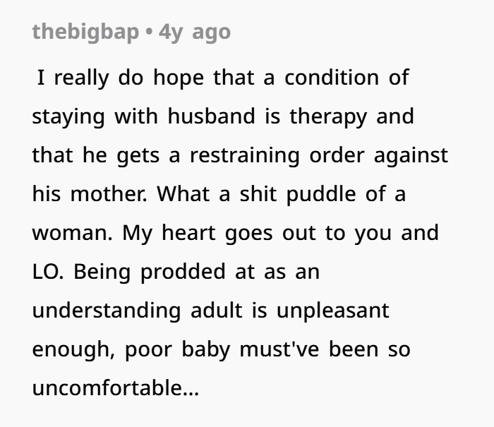 The poster left her husband as his mom had manipulated him and was plotting to steal their newborn, but he begged for forgiveness