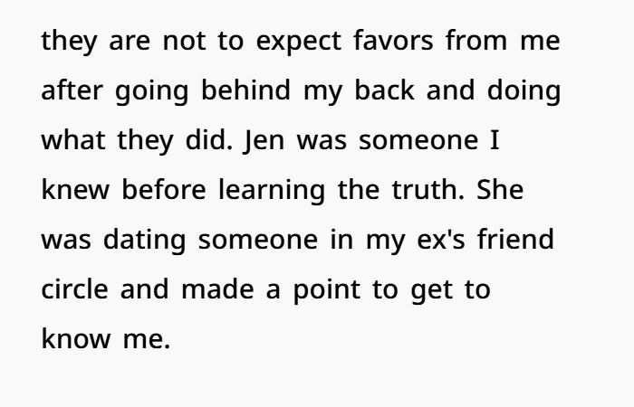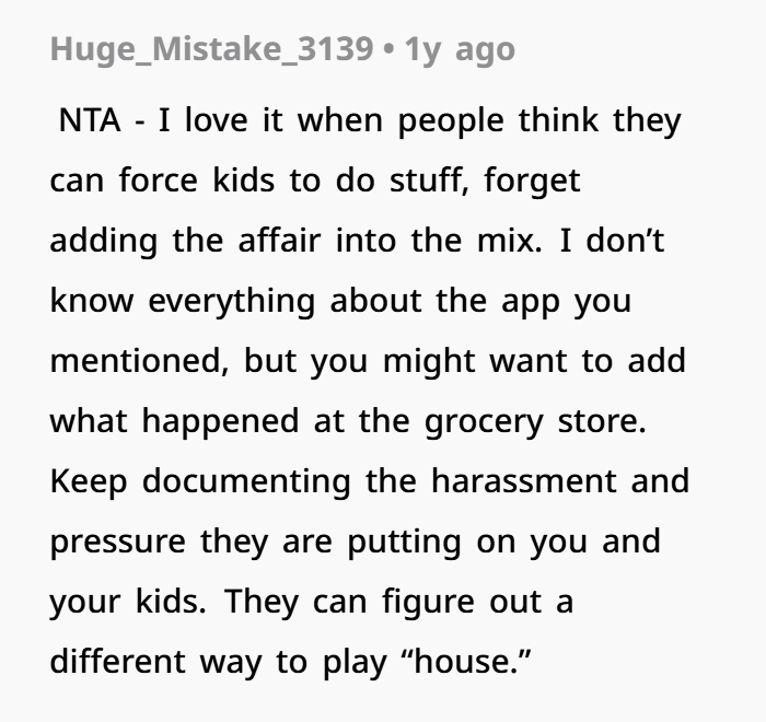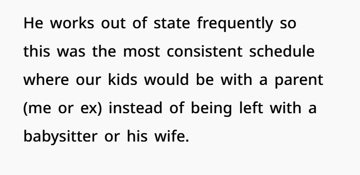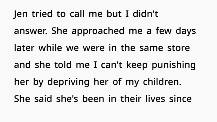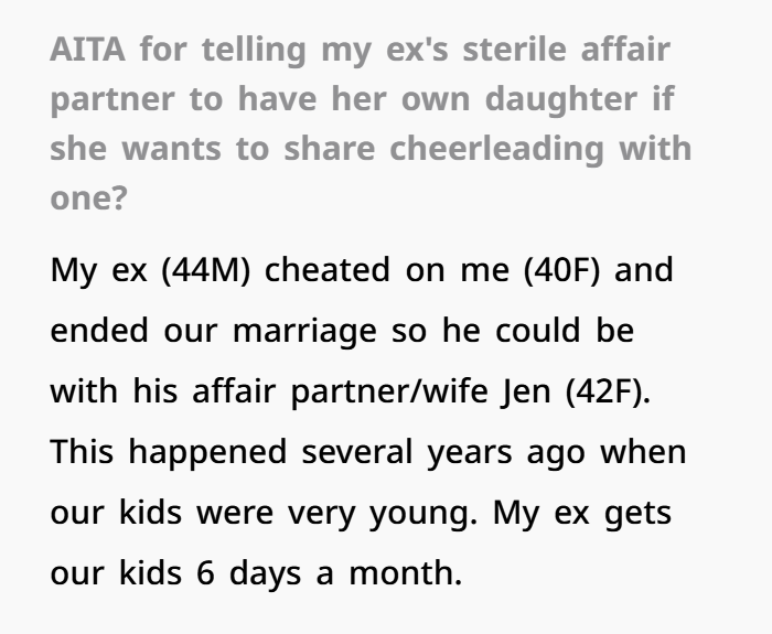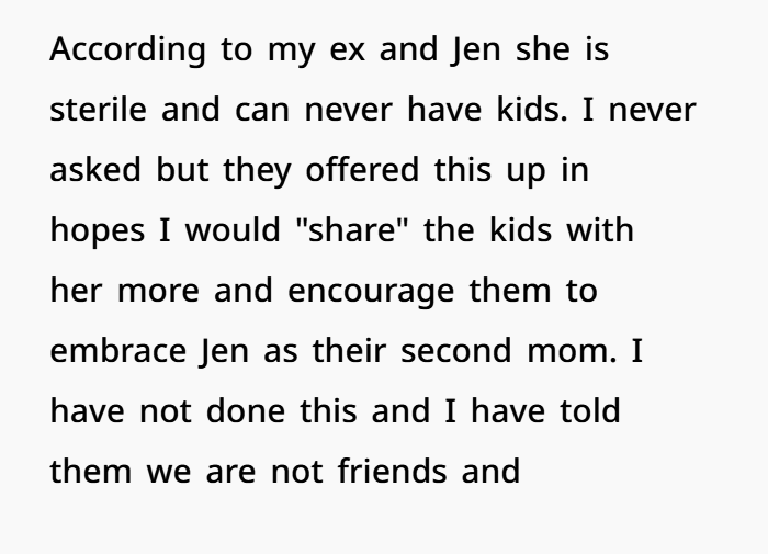 This situation revolves around a messy post-divorce dynamic where trust was already shattered long ago. The OP (40F) shares kids with her ex-husband (44M), who left the marriage after having an affair with Jen (42F)—a woman who had intentionally befriended OP before the truth came out. Since the split, OP has maintained primary custody, while her ex sees the kids a limited number of days each month due to his work situation. From the start, Jen and the ex tried to position her as a “second mom,” even disclosing her infertility in what felt like a strategic attempt to gain sympathy and access. OP, however, has kept firm boundaries and made it clear she’s not interested in blending families beyond what’s necessary.