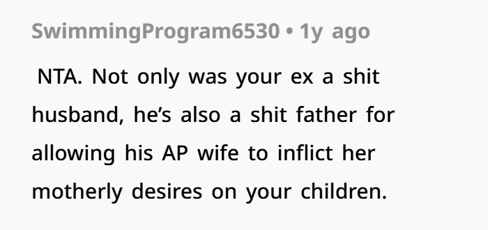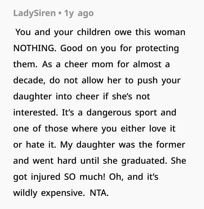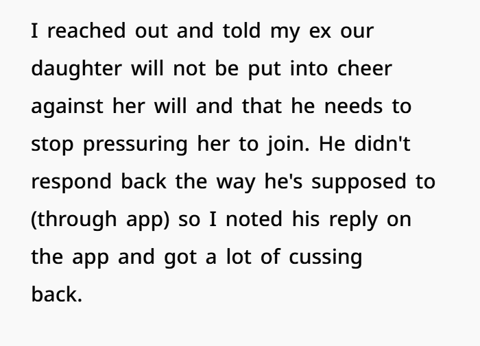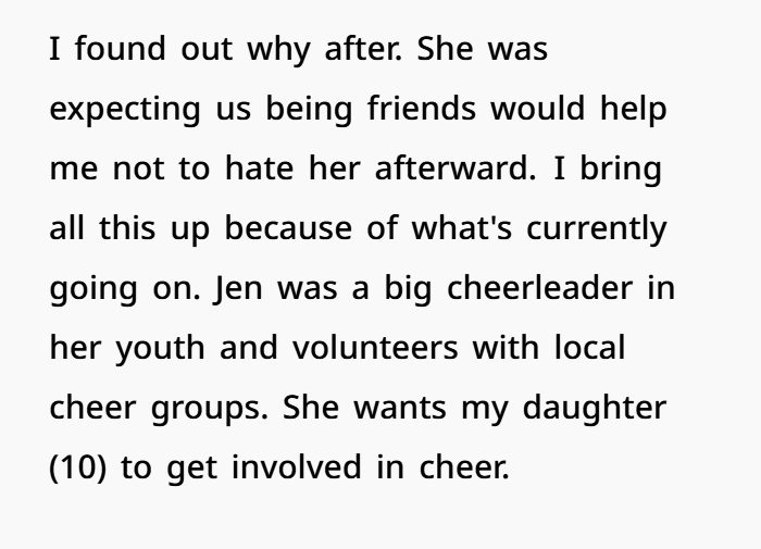 Jen isn’t just suggesting cheerleading. She’s pushing it. She’s emotionally invested in it. And when she says OP is “depriving” her, that’s a big red flag. Because the kids aren’t something to be shared like access rights—they’re individuals with preferences.