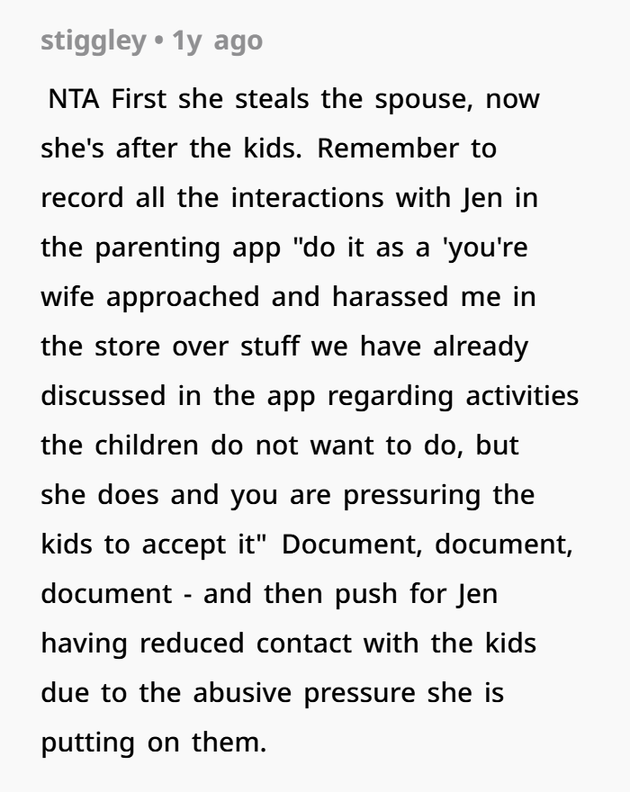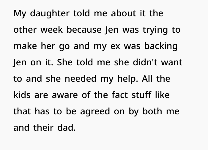 There’s also the legal angle. In most jurisdictions, step-parents don’t have equal decision-making rights unless formally granted. So Jen pushing for activities—and the ex backing her instead of coordinating properly—could actually be seen as undermining co-parenting agreements. OP documenting communication through the parenting app? That’s smart. Courts often favor parents who maintain clear, documented boundaries.