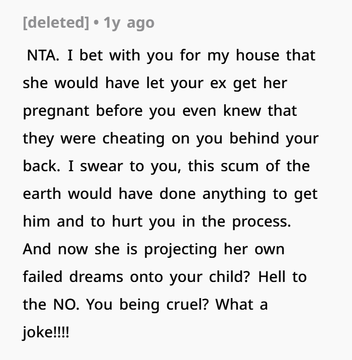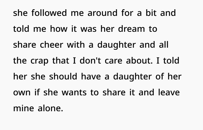 The current conflict centers around OP’s 10-year-old daughter, who is being pressured by Jen to join cheerleading—a passion Jen herself had growing up. The daughter doesn’t want to participate and asked her mom for help. OP stepped in and told her ex to stop pushing their child into something she doesn’t want. This escalated when Jen confronted OP in public, accusing her of “depriving” her of bonding experiences with the kids. After being followed and emotionally pressured, OP snapped and told Jen to have her own daughter if she wants to share cheerleading. That comment hit a nerve due to Jen’s infertility, and now OP is being labeled as cruel by her ex.