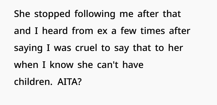 Infertility isn’t just a casual fact—it’s often tied to identity, loss, and sometimes trauma. Throwing it into an argument, even in frustration, is going to land as cruel. Not because OP owes Jen kindness, but because it weaponizes something deeply personal.