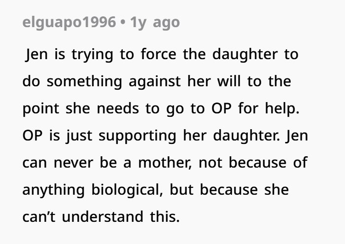 Her infertility is tragic, no question. That’s a deeply painful experience for many people, and it often comes with grief that doesn’t just go away. But—and this is important—that grief doesn’t give someone rights over another person’s child. Wanting a “mother-daughter experience” is understandable. Trying to create that by overriding a child’s wishes? That’s where it crosses a line.