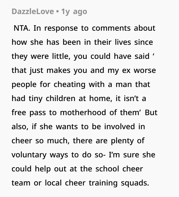From a purely human standpoint, it’s understandable how OP got there. She was pushed, followed, emotionally cornered, and probably triggered by years of resentment toward both her ex and Jen. This isn’t just about cheer—it’s about betrayal, boundaries being ignored, and someone trying to step into a role OP never agreed to share.