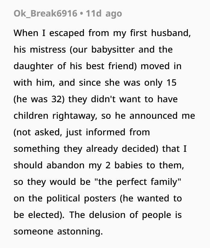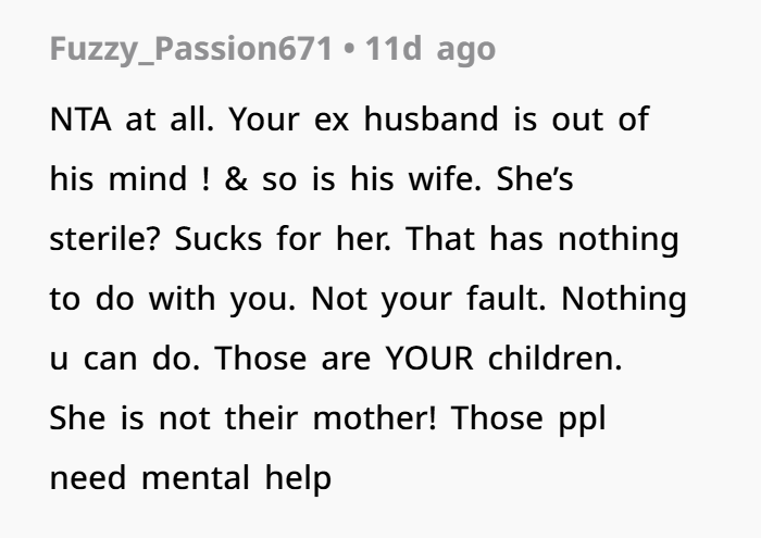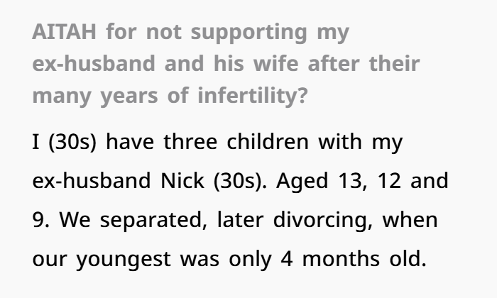 Infertility is a real, painful journey. I can understand that my ex and his wife asking for empathy makes sense—“We’ve struggled for years to have kids, now we want this role.” People expect others to show compassion.