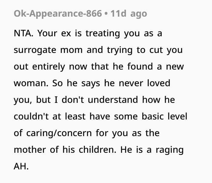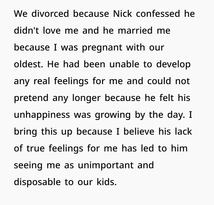 I (30s) have three kids with my ex‑husband, Nick (30s). We’re divorced. The kids are aged 13, 12 and 9. The marriage ended when our youngest was only 4 months old—because Nick admitted he didn’t love me, and married me only because I was pregnant with our oldest. I believe his lack of true feelings has meant he views me as dispensable in our kids’ lives.