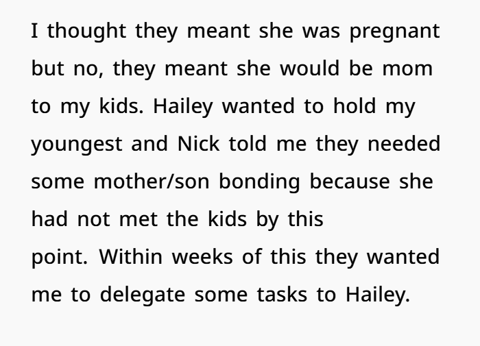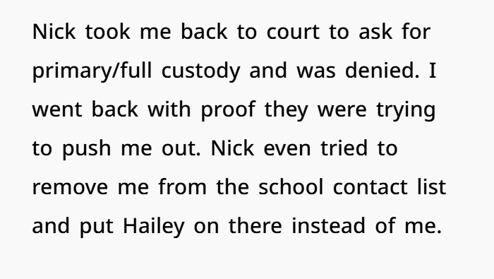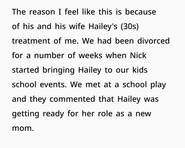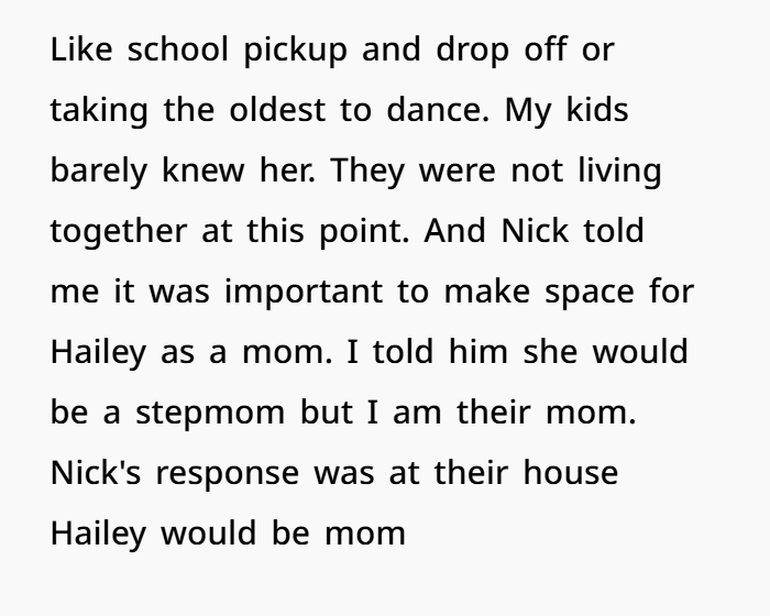 After the divorce, Nick began treating his soon‑to‑be wife, Hailey (30s), as if she were already the “mom” of my children—inviting her to school plays, expecting me to delegate tasks to her (school dropoffs, dance pickups) despite the kids barely knowing her, and insisting she be treated as a parent rather than a step‑parent. She has called me a “b‑tch” for saying I am their mother, not her. Nick even tried to remove me legally from the school contact list and give contact to Hailey instead.