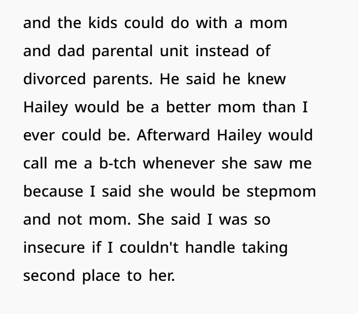 The poster had been co-parenting her 3 kids with her ex (Nick), when he suddenly introduced a new woman (Hailey) and forced them to bond with her