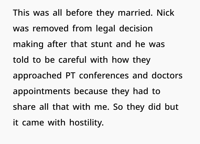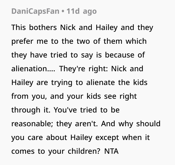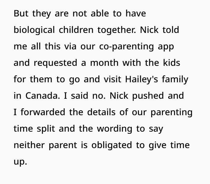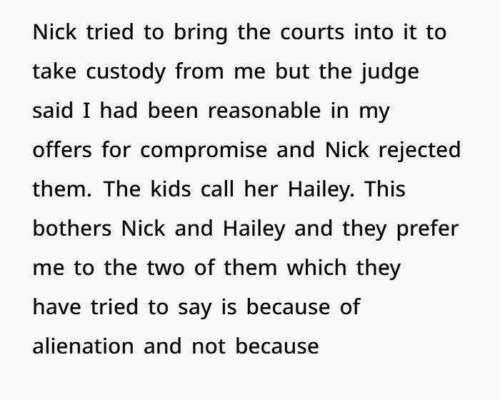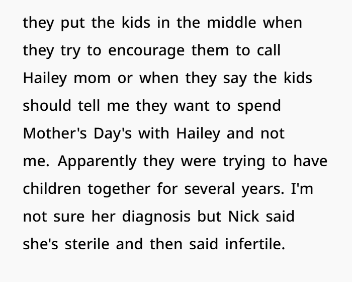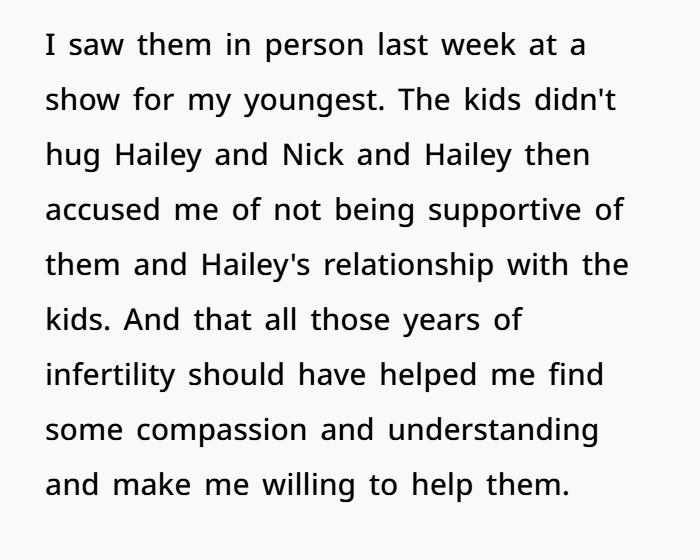 Now they say that because Hailey and Nick endured years of infertility (they are unable to have biological children together), I should support them more and let them have more access to the kids or treat Hailey more like “mom.” They accuse me of being unsupportive because I won’t just hand over time or treat Hailey as my “equal parent” in my children’s lives.