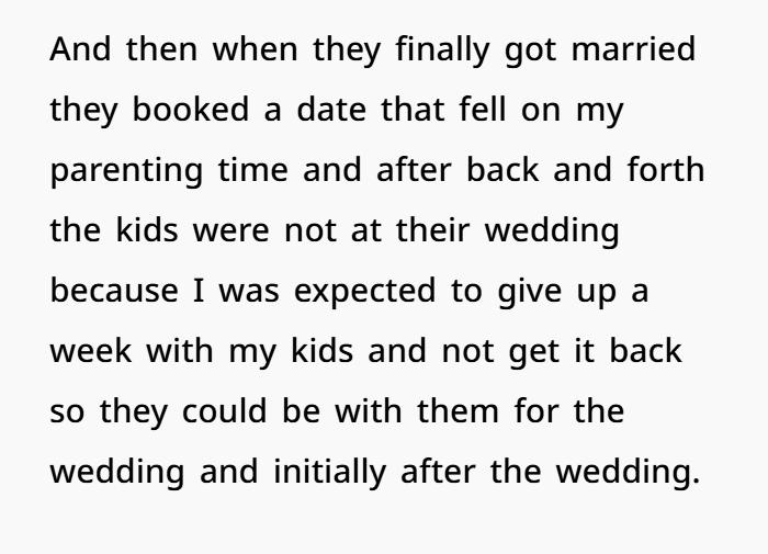When they married, they scheduled the wedding date to overlap with my parenting time and asked me to give up that week so their kids could attend—without giving me the time back. When I refused, he threatened court. The court denied him.