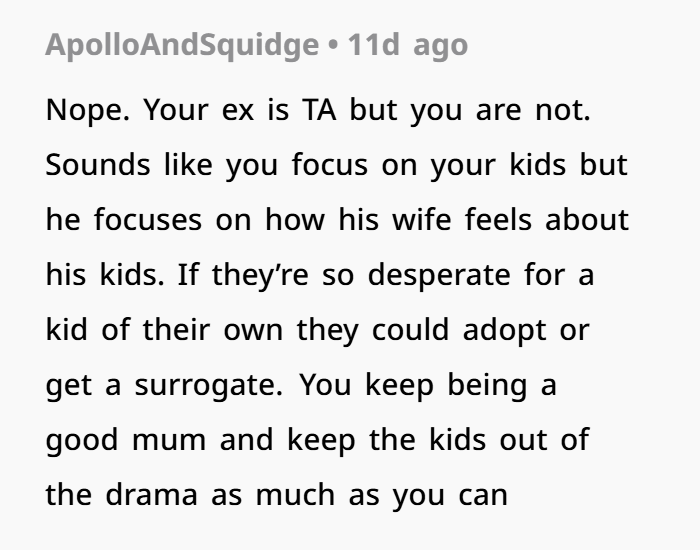 Given all that, I believe I am not the a**hole. I can be empathetic to their infertility journey—but that does not mean I must sacrifice my parenting rights or let them dictate my relationship with my kids. Supporting them emotionally (being kind, civil, cooperative) is one thing; giving up my role or time is another and that crosses into unfair territory.