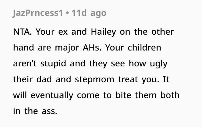 I’m standing up for my role, for my kids, and for boundaries. Being supportive doesn’t have to mean giving up everything. They can still have a relationship with Hailey as their step‑parent, but not at the cost of erasing or minimising me.