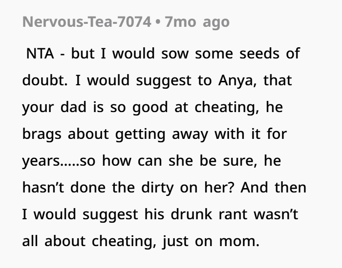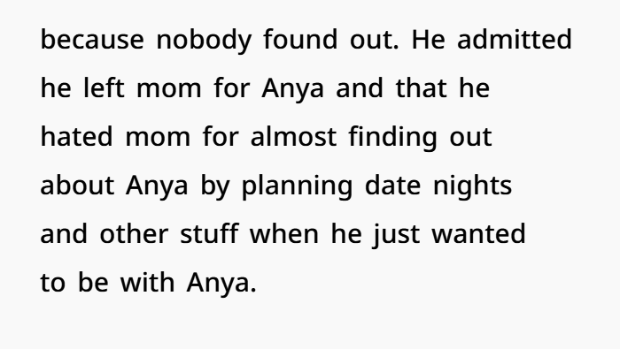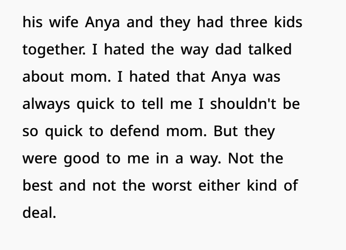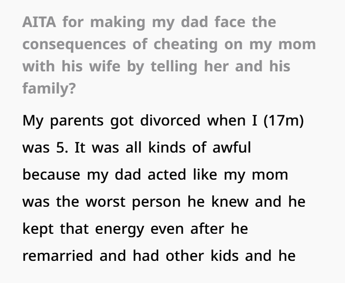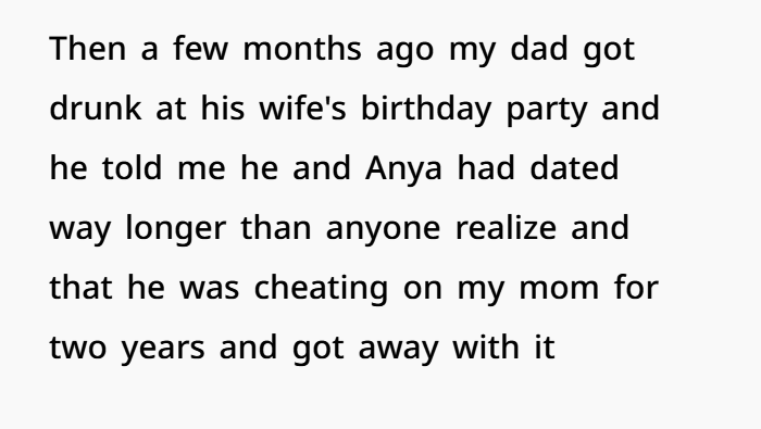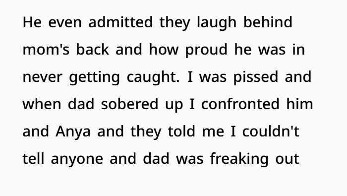 This story centers on a 17-year-old caught in years of bitterness, lies, and emotional manipulation following his parents’ divorce. Growing up, he watched his dad constantly tear down his mom, painting her as the villain while building a new life with his second wife, Anya. Despite the tension, he maintained a complicated relationship with his dad’s new family—never fully comfortable, but not completely disconnected either. That fragile balance shattered when his dad, drunk at a birthday party, casually admitted to cheating on his mom for years and leaving her for Anya—while proudly mocking the fact that he never got caught.