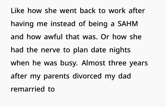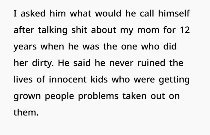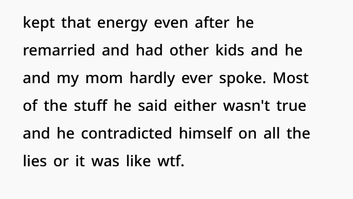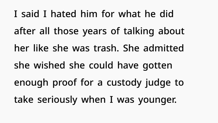For over a decade, this guy grew up hearing his dad tear his mom apart. Not just occasional complaints—but consistent, targeted criticism that painted her as selfish, unreasonable, even a bad parent. That kind of environment does something to a kid. It creates confusion. It forces them to internally pick sides, even when they shouldn’t have to.