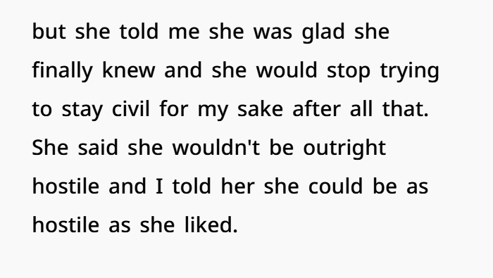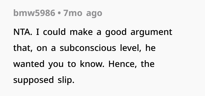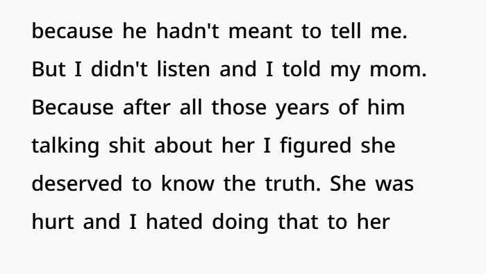 And honestly, from an ethical standpoint, telling his mom makes sense. She was directly affected. She lived through the marriage, the accusations, and the fallout—without ever knowing the full truth. Finding out now hurts, sure, but it also gives her clarity. It validates that she wasn’t crazy or unreasonable back then.