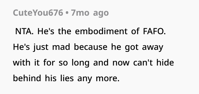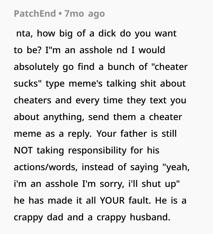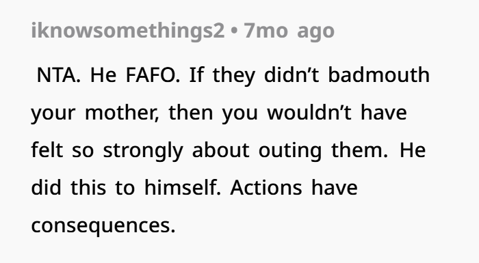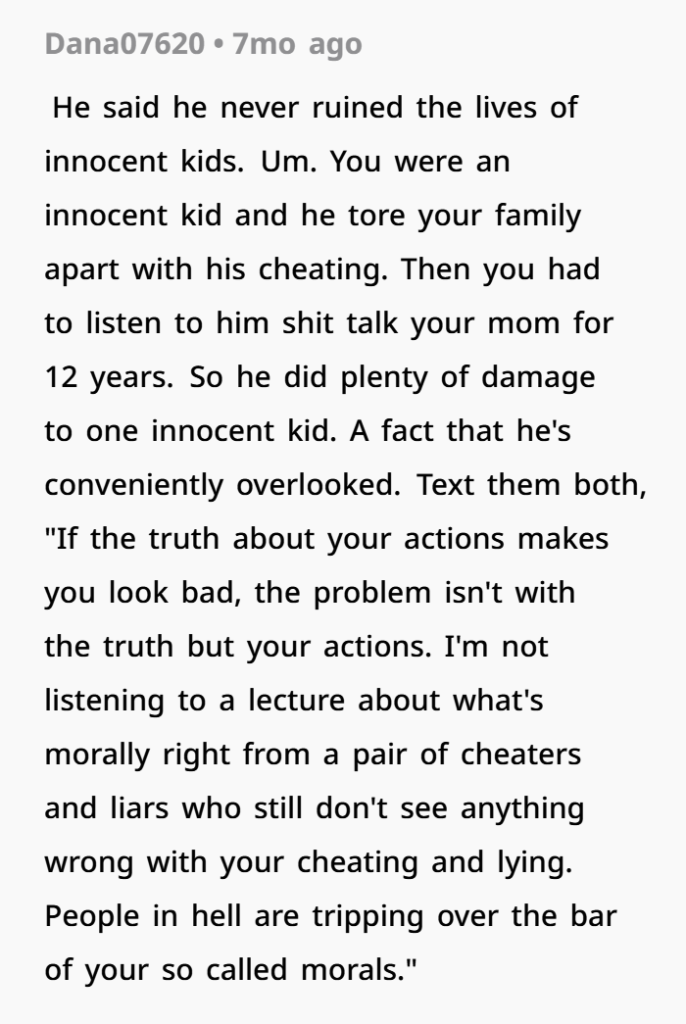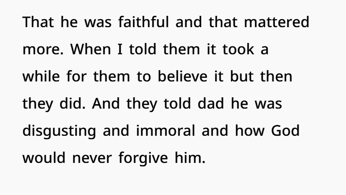 On one hand, his reasoning is understandable. The dad’s family had taken a stance for years—they defended him, dismissed concerns, and reinforced the idea that he was the “faithful” one. So from his perspective, they were supporting a false image. Telling them felt like setting the record straight.