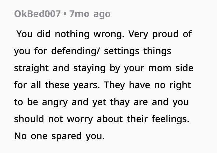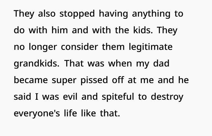 That confession flipped everything. Angry and feeling his mom deserved the truth after years of being blamed, he told her—and then went a step further by telling his dad’s entire family. The fallout was massive: his dad’s relatives cut him off, condemned his actions, and even rejected his younger kids. Now his dad and stepmom are furious, accusing him of destroying innocent lives and causing collateral damage. Caught between truth and consequences, he’s left wondering if exposing the lie made him justified—or if he crossed a line.