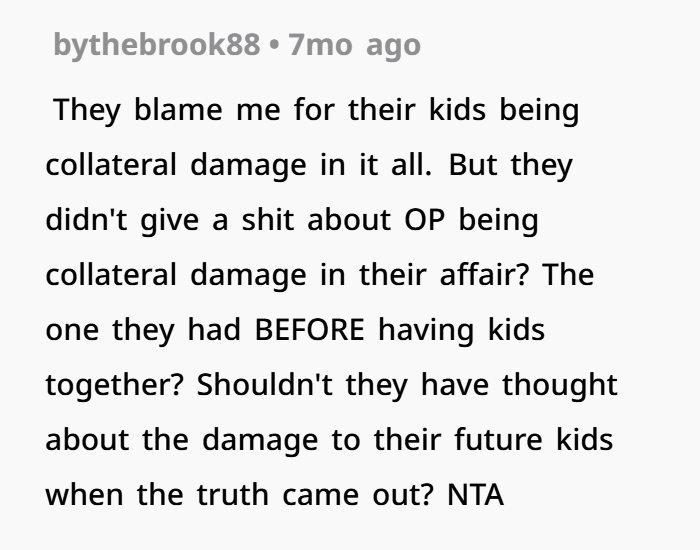Even the argument about “innocent kids” is complicated. Yes, the younger kids are innocent. But the environment that led to this fallout? That was created by the dad’s choices long before the truth came out.