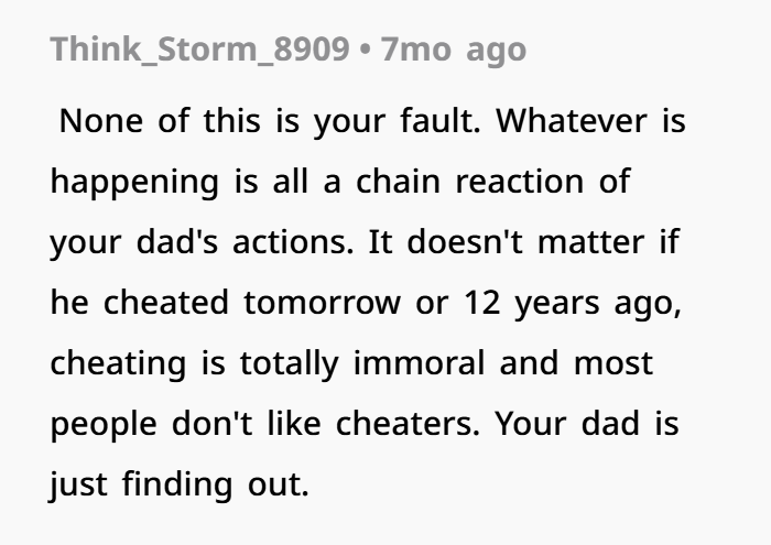 - The cause of the situation is the dad’s actions—cheating, lying, and building a life on that foundation.