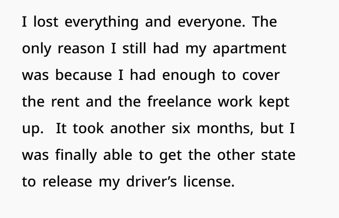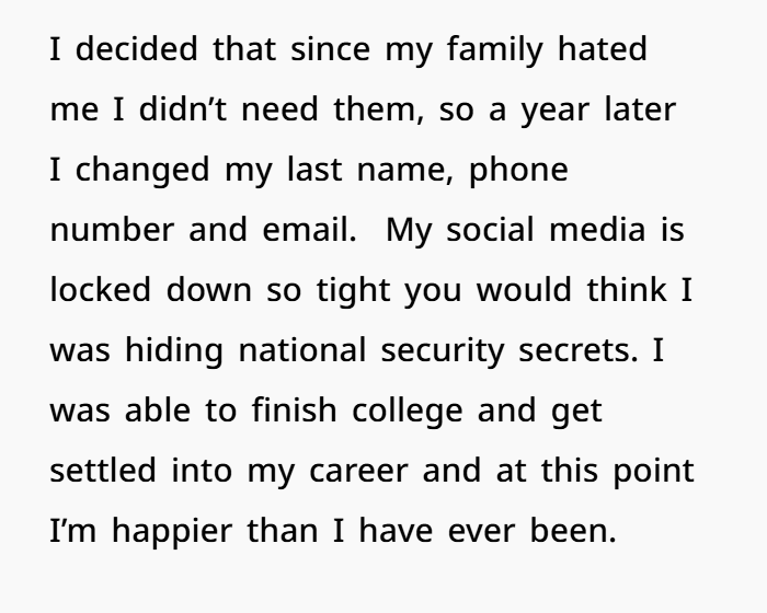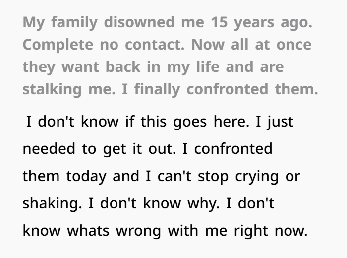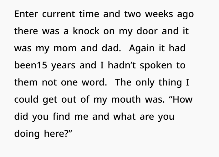 Then, two weeks ago — my mom and dad showed up at my door. After 15 years of zero contact. No apologies, no warning, no respect for my boundaries. They tracked me down with a PI and expected me to just welcome them back. I didn’t. I shut the door. Told them to go away. And now… I’m scared, confused, and emotionally wrecked.