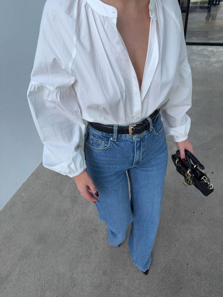 Example: A white shirt, blue jeans, and a black bag. Simple, classic, and always stylish.