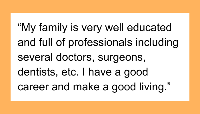 OP’s family is full of professionals who tie worth to job titles. They respect “surgeon,” “dentist,” and “engineer,” but scoff at “contractor” or “roofer,” even though those roles can be just as (or more) lucrative. This kind of career elitism isn’t uncommon. People confuse respectability with value, thinking only those with degrees are worthy of admiration.