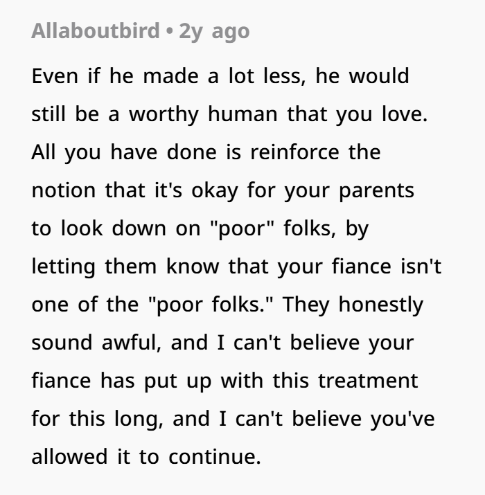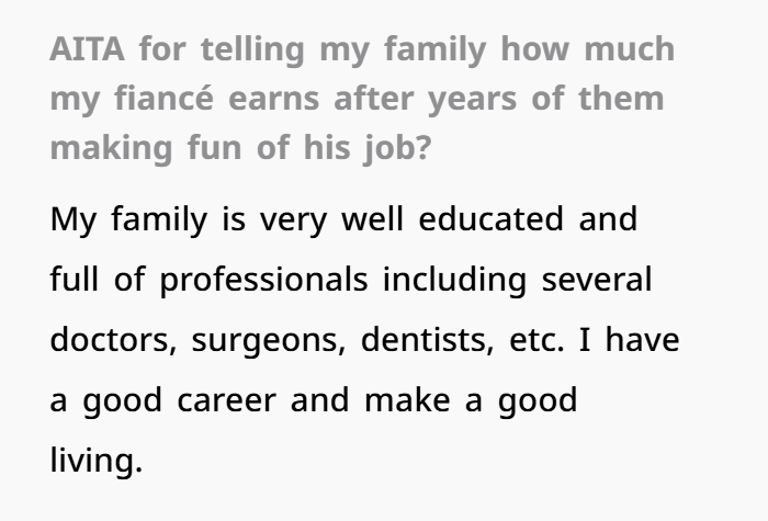 OP comes from a family stacked with professionals—doctors, dentists, and high-earning career types. They’re proud of their titles and income, and it’s clear from the get-go that they didn’t take her fiancé seriously. Why? Because he works in construction.
