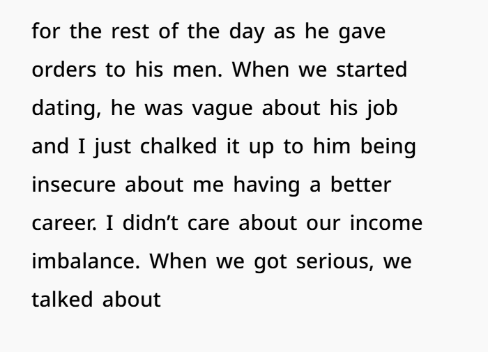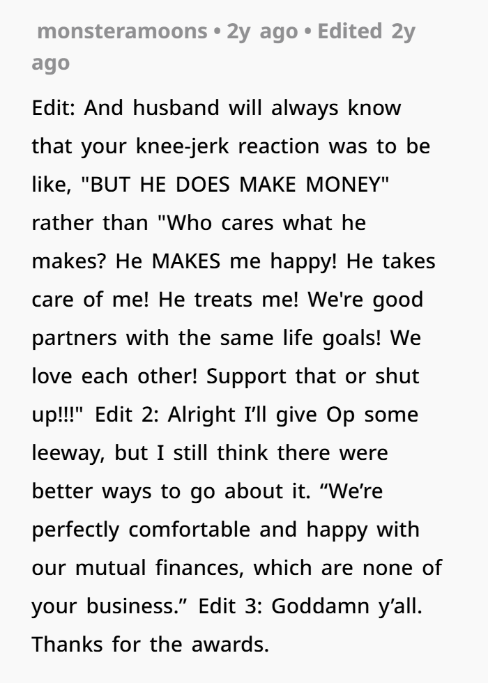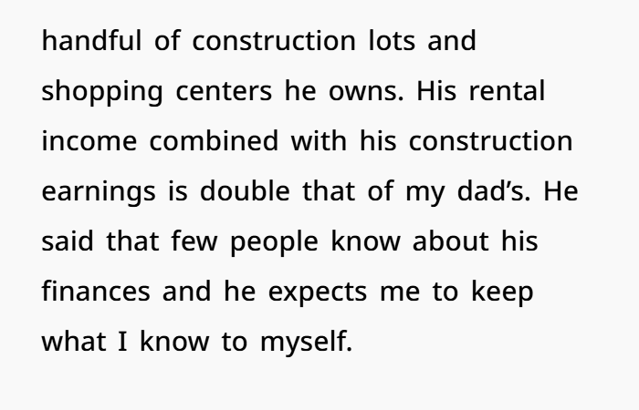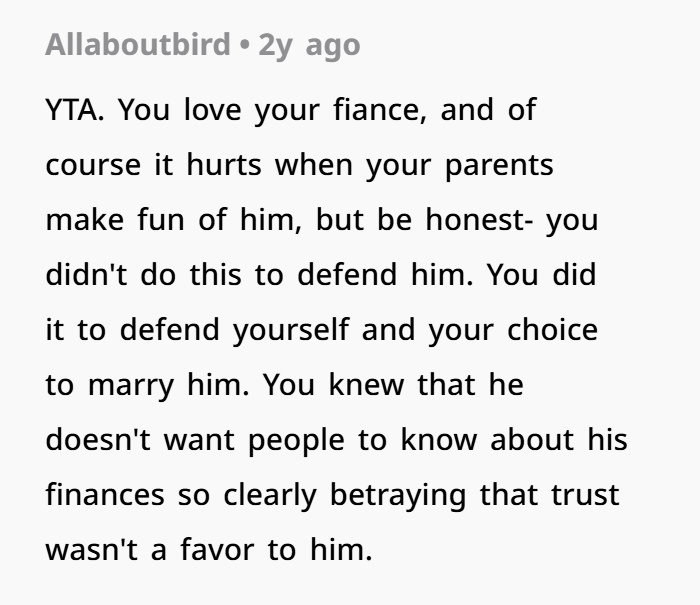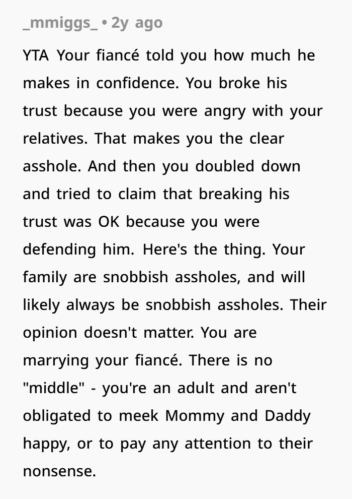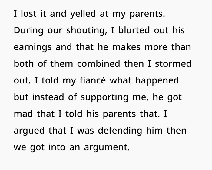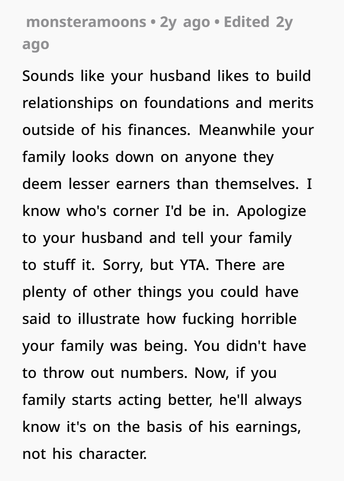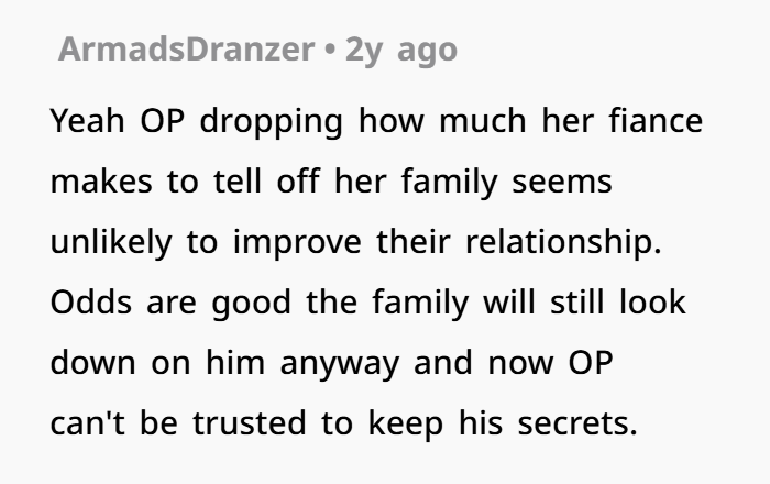 So when OP told her family about his income—even though she meant well—it felt like a betrayal to him. For someone who’s protective of his success, having that revealed in a moment of anger probably felt like losing control over something he’d worked hard to manage quietly.