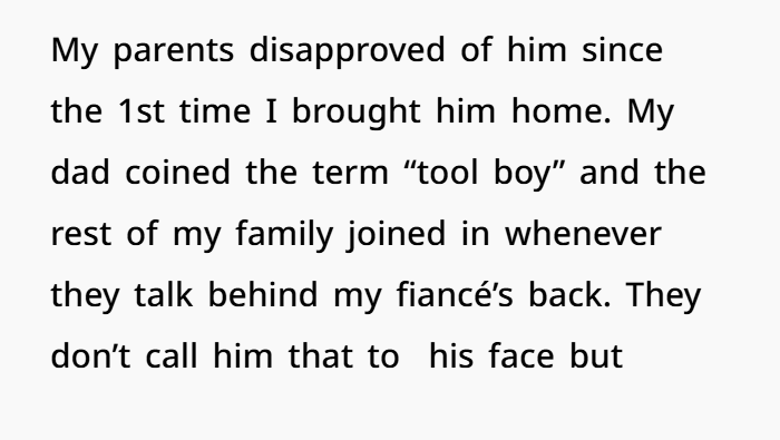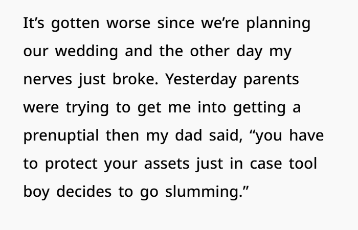 Still, years of her family calling him “tool boy” and making degrading remarks finally pushed OP over the edge. When they suggested a prenup to “protect her assets,” she snapped—and told them just how much money he really makes. Her family was stunned. Her fiancé? Not thrilled.