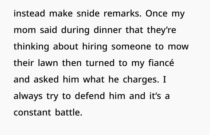 OP had every right to defend her fiancé. She’s been battling her family’s snide comments for years. Every dinner turns into a roast session. Her parents ask him what he charges to mow lawns. They call him tool boy behind his back. That’s beyond disrespectful—it’s dehumanizing.