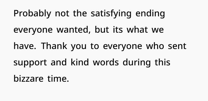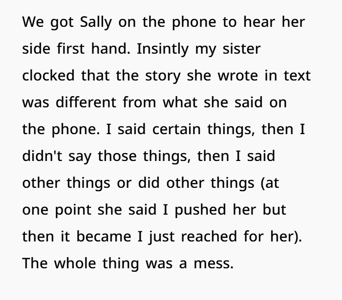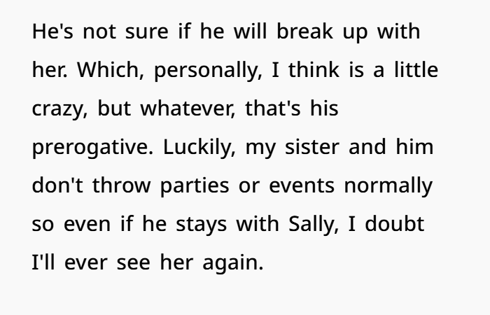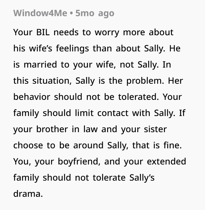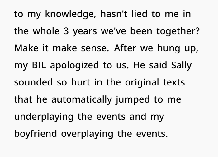 In the end, the updates basically confirmed what OP already knew: Sally was lying, inconsistent, and manipulative, and BIL was caught up in protecting her instead of looking at the facts. OP didn’t escalate, didn’t yell, didn’t attack. She simply stood up for her boyfriend and enforced a boundary. Honestly? Kinda the bare minimum.