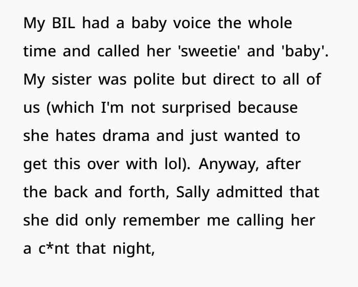 The gaslighting element is also strong here. Gaslighting doesn’t require saying “you’re crazy.” It can be subtle, like rewriting events to make others doubt their experience. Sally tried to do that with OP’s BIL. And the saddest part? He actually believed her over someone he has known for a decade. That’s how manipulation works — it preys on emotional bonds and guilt.