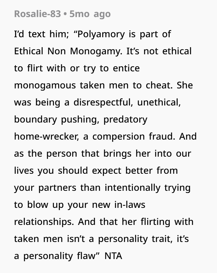 It’s also worth noting that in ethical polyamory communities, her behavior is not considered normal or acceptable. Anyone familiar with polyamory best‑practices (Dan Savage talks about this a lot, and books like More Than Two emphasize it too) knows that respect, consent, communication, and non‑coercive behavior are core principles. Sally violating boundaries and then playing victim actually contradicts poly values. So the “polyphobic” accusation she threw out? That was basically a smokescreen. And honestly, very harmful, because using social‑justice or identity‑based language to deflect accountability is manipulative.
