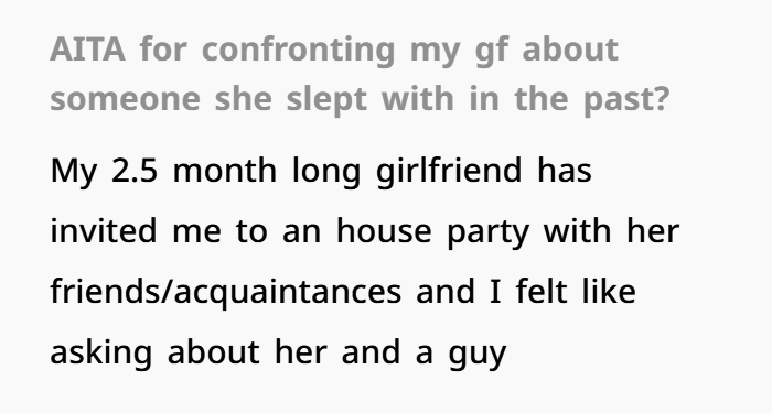 This situation revolves around a fairly new relationship—just 2.5 months in—where expectations and boundaries are still being figured out. The narrator attended a house party with his girlfriend and noticed a guy she had mentioned before in casual stories. Curious, and maybe a bit uneasy, he asked about their history. That’s when she told him they had slept together once. Nothing ongoing, nothing hidden intentionally—just something from her past that hadn’t come up directly before.