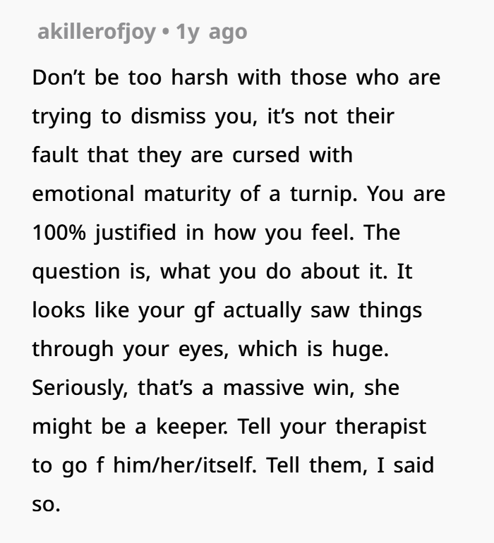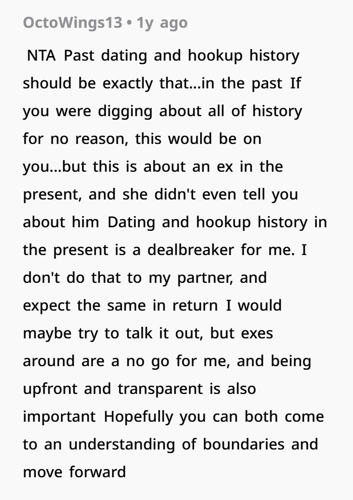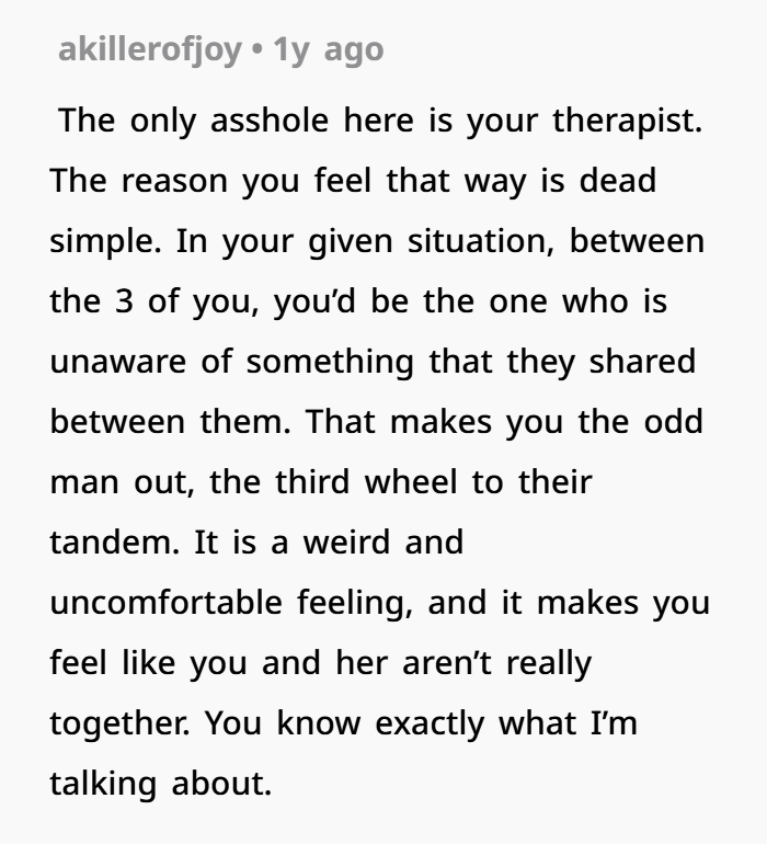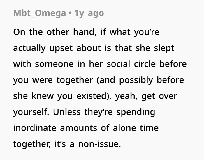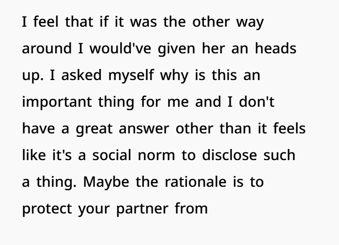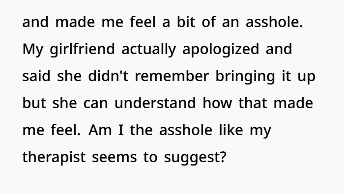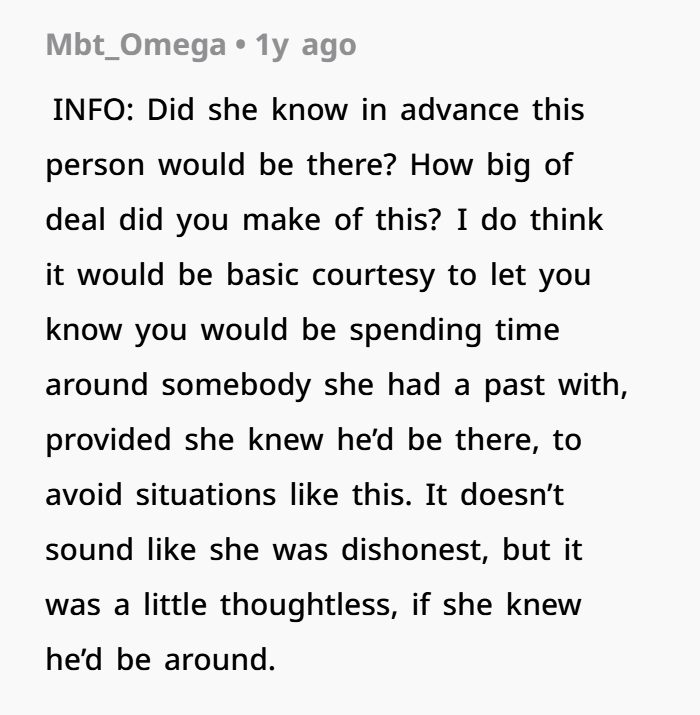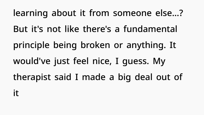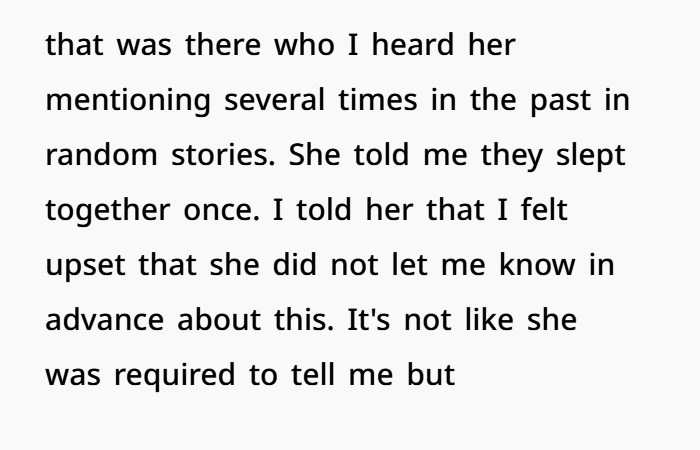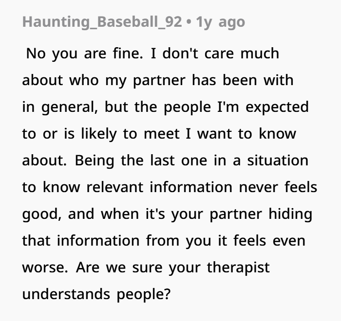 What followed wasn’t a full-blown fight, but more of an internal conflict turned into a conversation. He admitted feeling upset—not because she did anything wrong, but because she hadn’t given him a “heads up.” In his mind, it felt like a social courtesy, something that could’ve avoided awkwardness. His girlfriend responded calmly, even apologized, and said she understood his feelings. Still, his therapist later suggested he might’ve made a bigger deal out of it than necessary. Now he’s left wondering—was this a reasonable boundary, or just insecurity creeping in?
