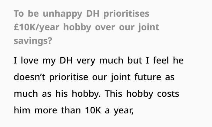 This is one of those quiet relationship dilemmas that creeps up on you until suddenly—you’re sitting in the middle of it, wondering if you’re being unreasonable or just finally noticing a pattern. In this post, the original poster (OP), going by Loopylampshade, shares a heartfelt concern: her husband spends over £10,000 a year on a personal hobby, and while she doesn’t begrudge him the joy it brings, she’s starting to feel like their shared future takes a backseat.