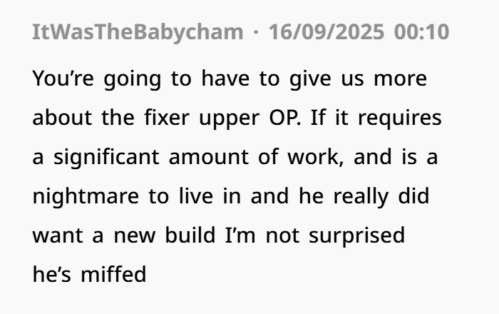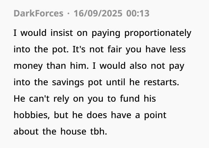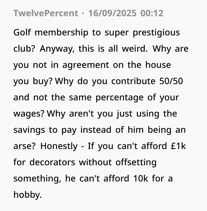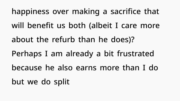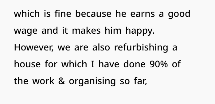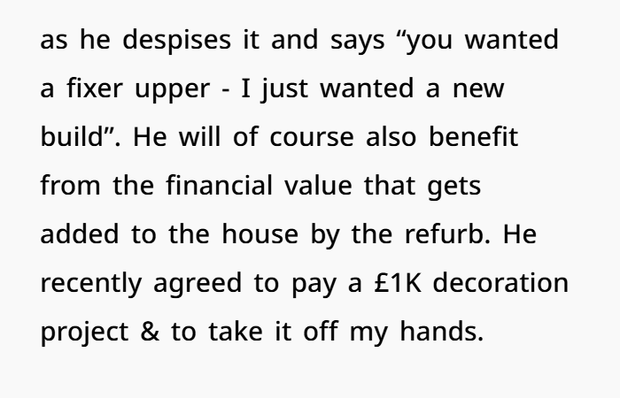 They’re currently working on refurbishing a house, a project OP has led almost entirely on her own—organizing, managing, pushing it forward. Her husband admits he “despises” the work and wanted a new build instead, so he’s distanced himself emotionally and practically. Recently, he agreed to take over a £1K decoration job, but then said he wouldn’t contribute to their joint savings fund for two months as a trade-off—because that would mean giving up hobby spending, which he refuses to pause even briefly.