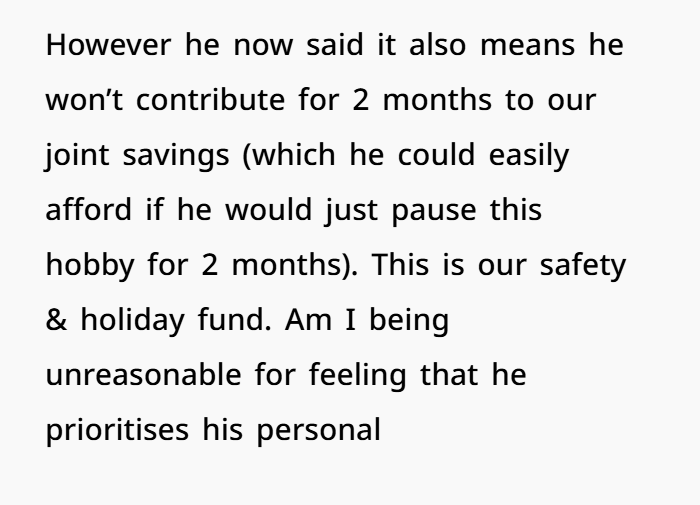 The problem? That joint savings account is their safety net and holiday fund. OP feels frustrated and hurt that her husband won’t sacrifice even two months of hobby money to prioritize something that benefits them both. On top of that, they split bills 50/50 even though he earns significantly more—leaving her with less disposable income while still investing all her time and energy into their shared home. So now she’s asking: is she being unreasonable for feeling like he’s prioritising his happiness over their future?