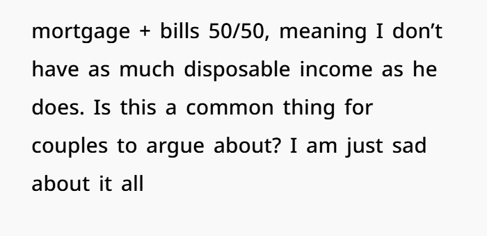The author of the post and her husband both have decent jobs and split the bills 50/50 – but the woman considers the situation quite unfair by any measure