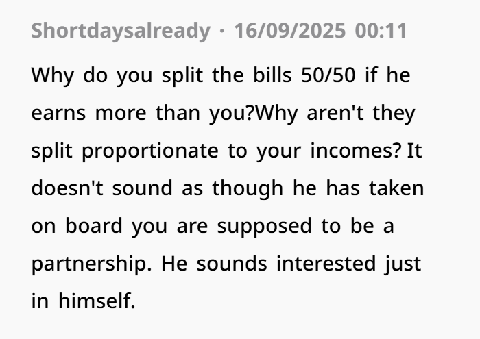 One thing that stands out in your post is this: “we split mortgage and bills 50/50 even though he earns more.” That sounds fair on paper, right?