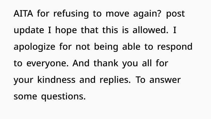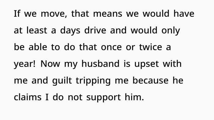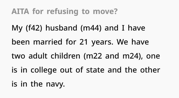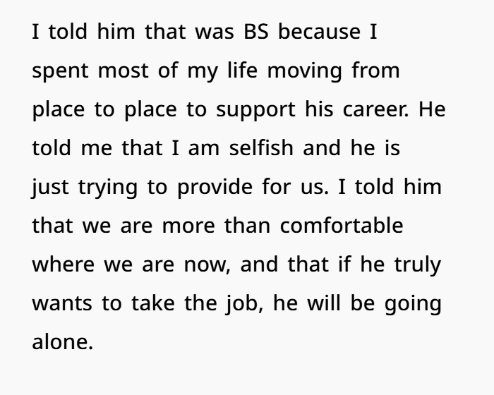 You’re not the A-hole for refusing to move again. You’ve already moved mountains for your husband’s career. You’ve earned your roots, your routine, and your right to say, “this time, I’m staying.”