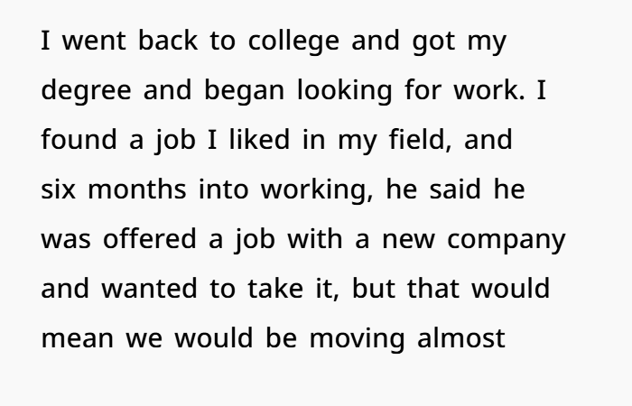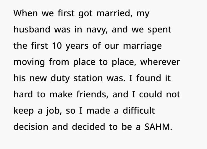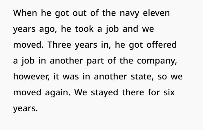 After over two decades of marriage, countless relocations, and full-time support of her husband’s career—from Navy moves to corporate climbs—this wife said enough is enough. The couple, married since they were teens, have moved multiple times across the country for his job. She gave up her early career dreams to be a stay-at-home mom, sacrificed stability, and repeatedly restarted her life. Now, with both sons grown and her own career finally thriving, her husband wants to move—again—for another promotion.
