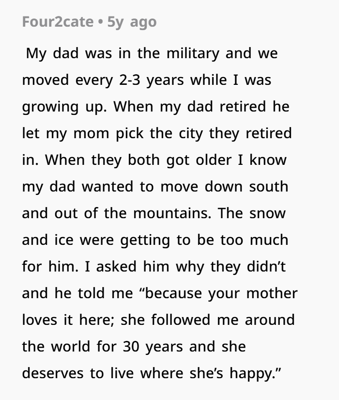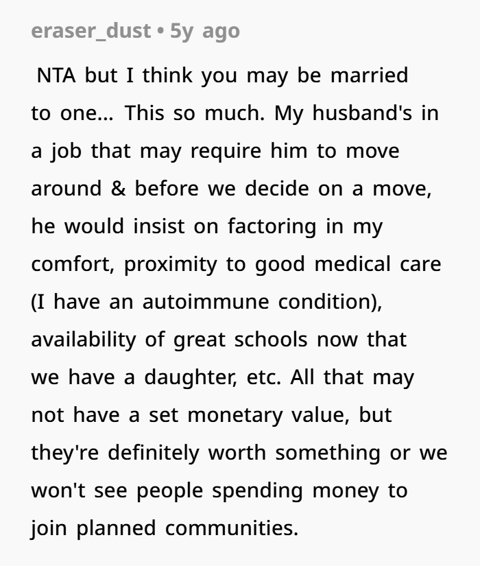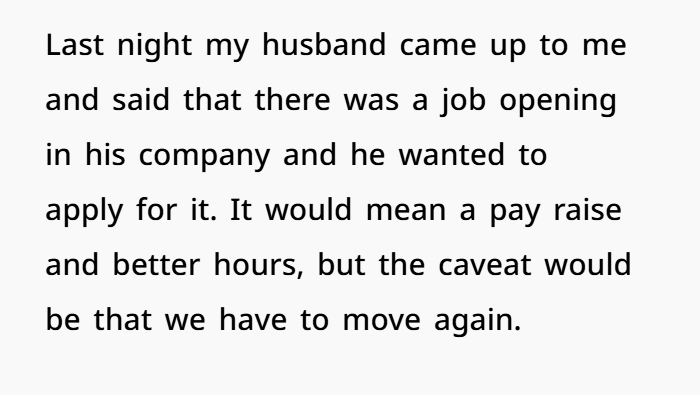 The wife’s decision to not move again isn’t about stubbornness. It’s a boundary. Boundaries aren’t ultimatums—they’re self-respect.