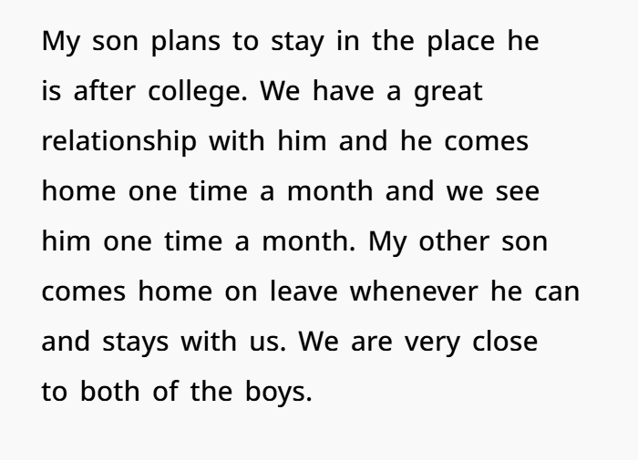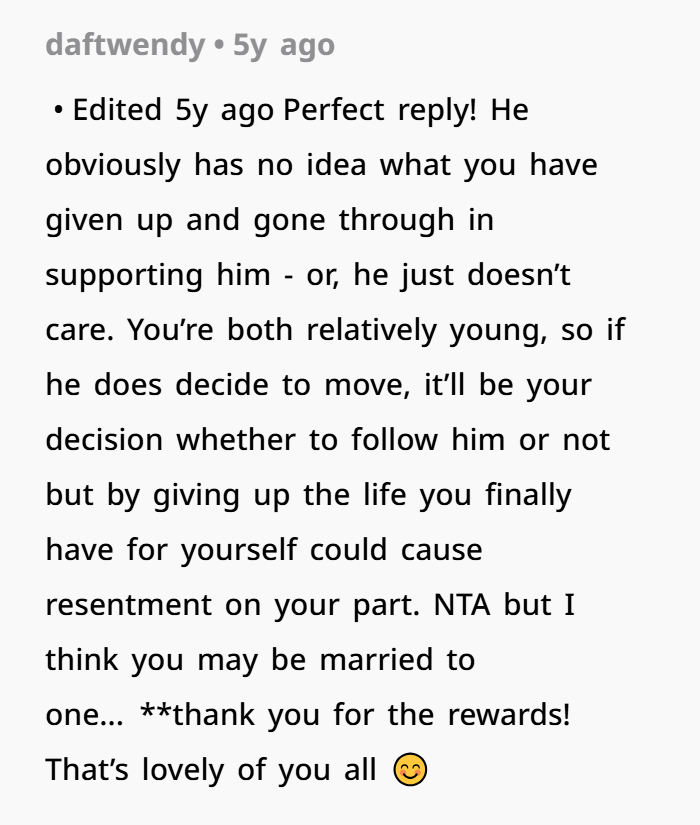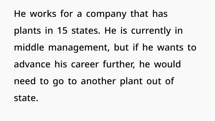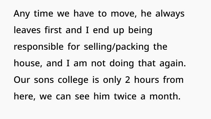 But this time, she’s not budging. She’s in a job she loves, earning great money, and has built a support system for the first time in years. The move would not only mean a massive pay cut and long commute for her, but it would sever closeness with her college-aged son. Her refusal sparked a rift—he accused her of being unsupportive and selfish. He even left to “think.” But she’s holding the line: she’s not uprooting her life anymore, and if he wants to go, he’ll be going alone.