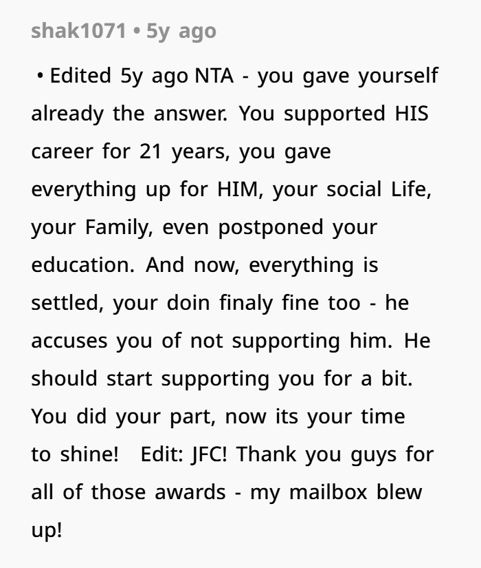 When her husband left the Navy, she finally got a taste of personal progress. She went back to college, got a degree, and landed a job in her field. After another move, she found a high-paying role, built community ties, and finally created a life for her. That’s not selfish—it’s survival.